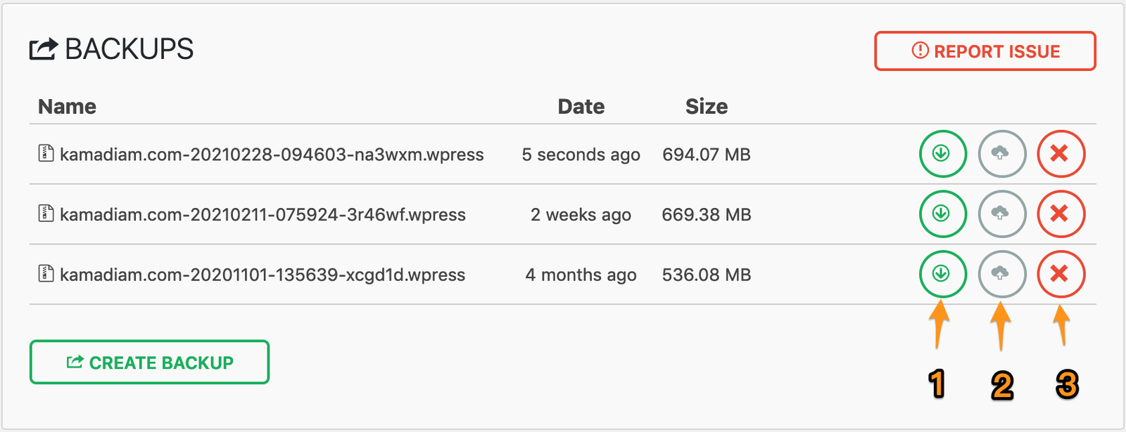 此外,頁面頂部還有「CREATE BACKUP」按鈕,可以快速建立新的備份。