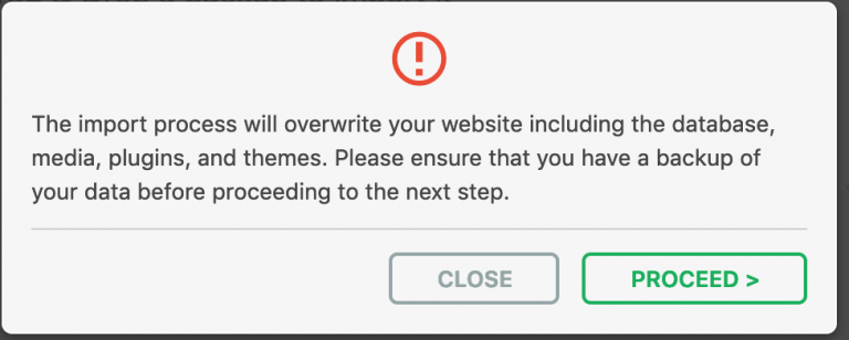 重要提醒:點擊「PROCEED >」按鈕後,會開始恢復網站。此操作會覆蓋現有的資料庫、外掛、佈景主題和所有內容,請務必確認這是你想要執行的操作。