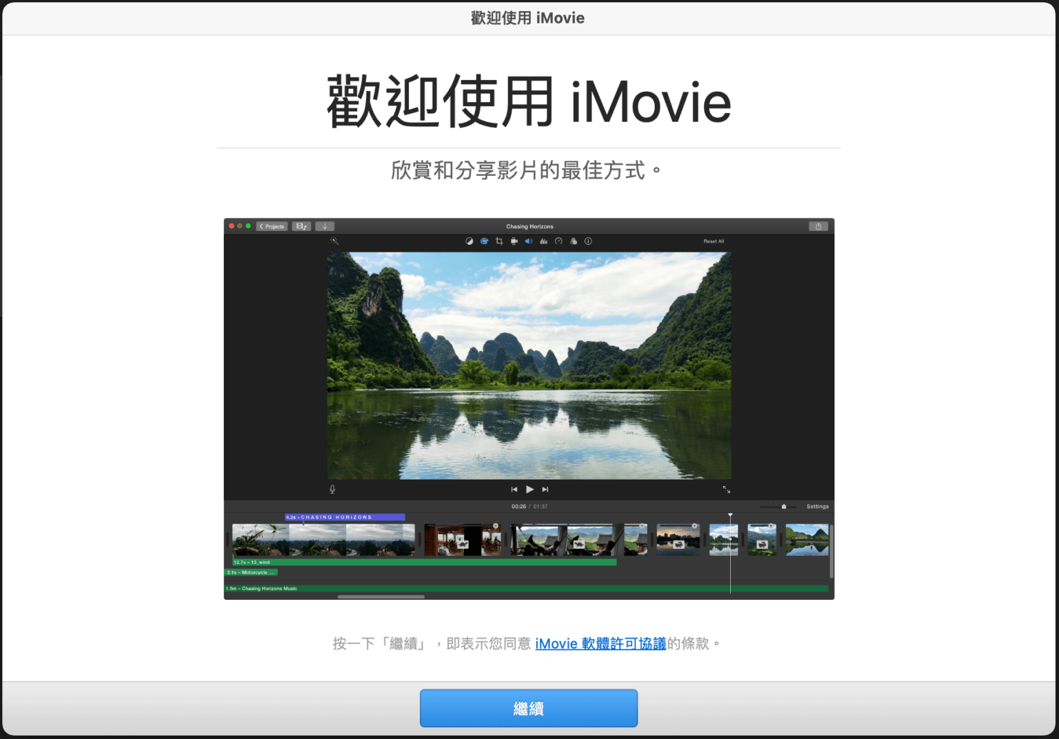 初次打開 iMovie 看看,iMovie 是蘋果系統提供的免費剪輯軟體,聽說介面簡單易用,適合初學者,5 分鐘入門,20 分鐘完成第一個影片。