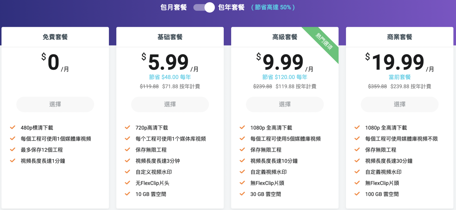 免費版本有個缺點,就是開頭會有 FlexClip 片頭,只要升級到基本套餐,就可移除 FlexClip 片頭,並擁有自定義的浮水印。