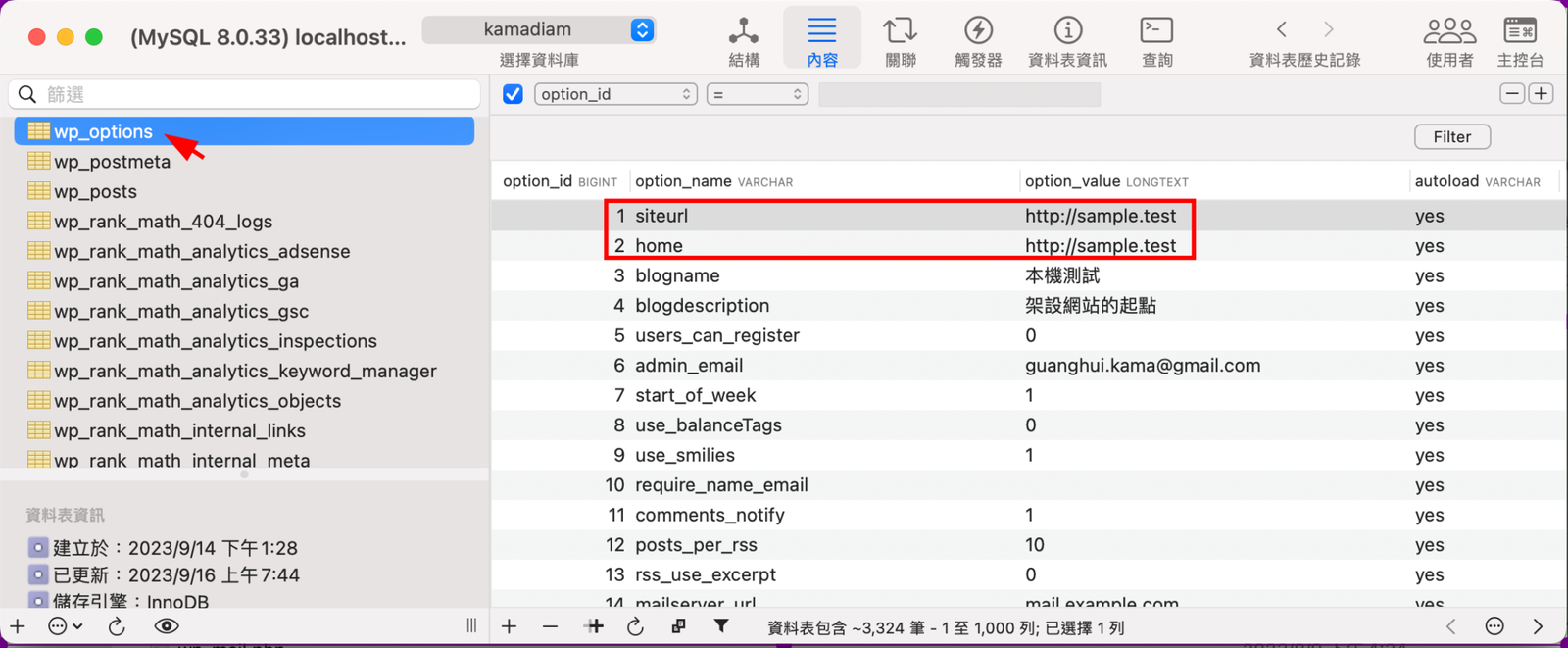 我們在前面已經建立了 http://sample.test 本機站台,所以必須將正式站台的網址改成本機網址。這樣 WordPress 才能正確載入資源和處理連結。