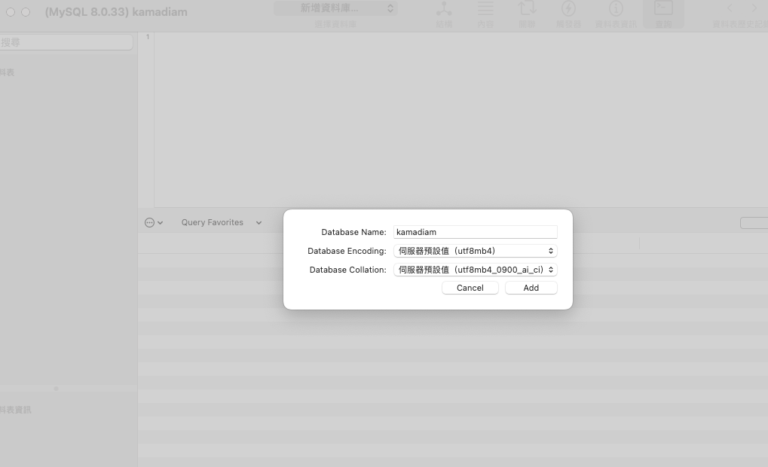 選擇新增資料庫後,填寫你的資料庫名稱(例如:kamadiam)。然後按"Add",即完成新建資料庫。