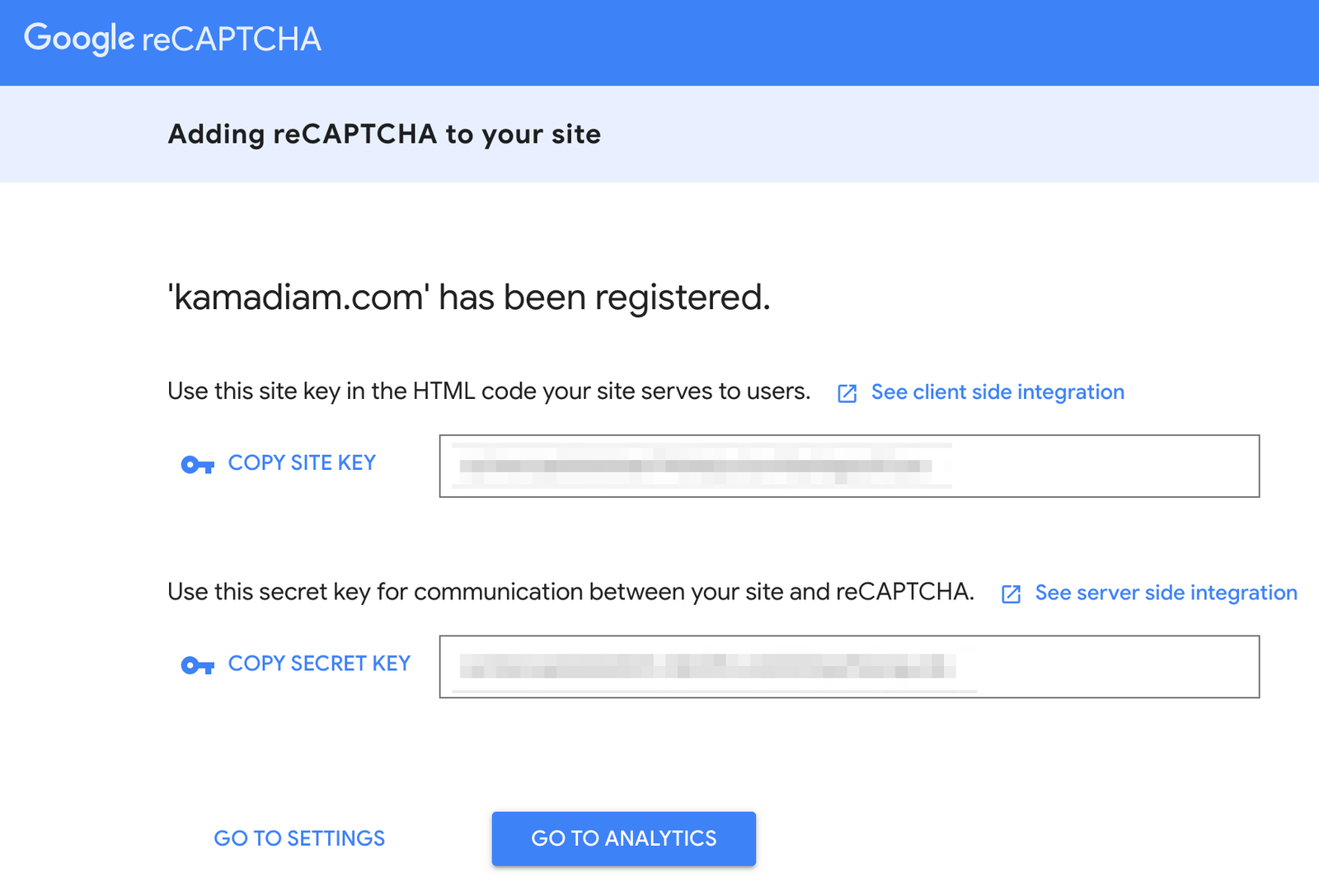 下方就會出現 SITE KEY 和 SECRET KEY。