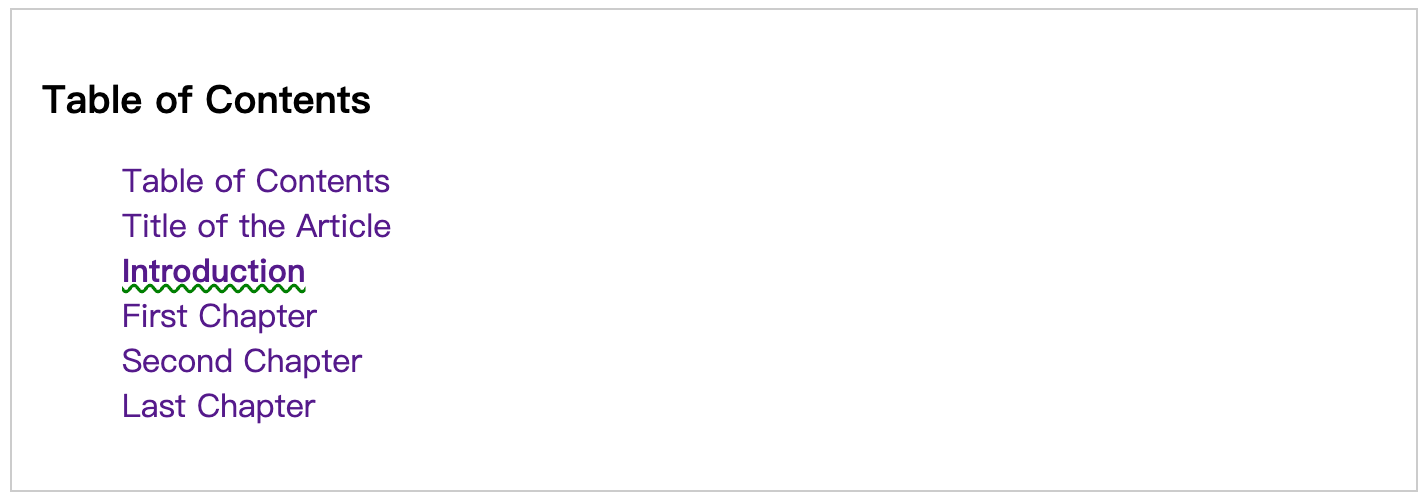建立 ToC 首先要正確建置 HTML。為了使 ToC 有效地工作,必須正確設定文件的標題(如 H2, H3 等)。