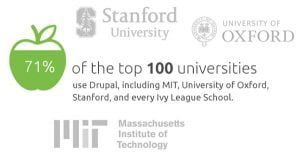 71% 全球前 100 大學也都使用 Drupal 架設網站,包含 MIT、劍橋大學、史丹佛大學、和所有常春藤盟校。