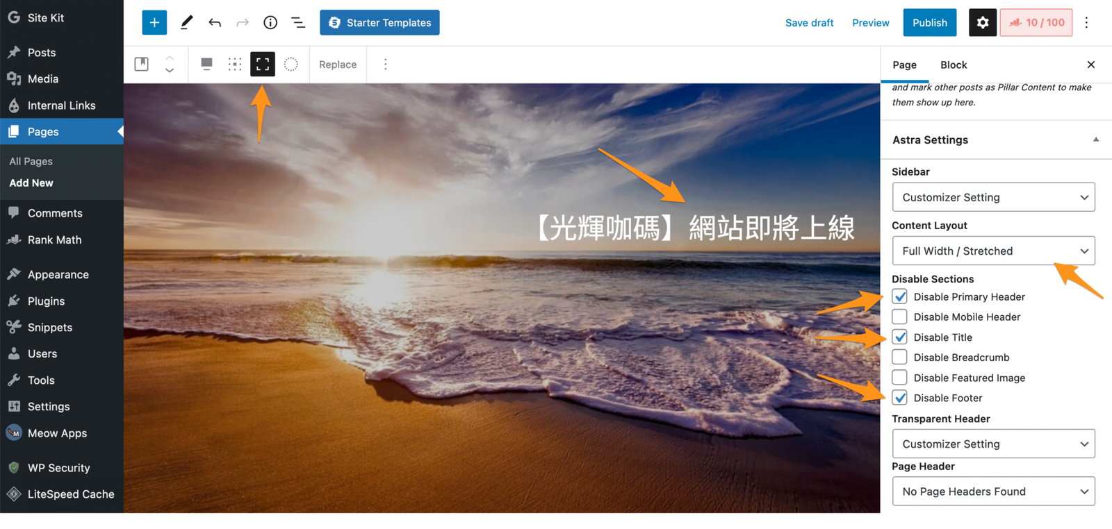 Astra 調整不顯示頁首和頁尾,內容設定為全螢幕寬度。