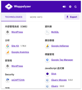 Wappalyzer 可以幫你研究(偷看)別人的網站是用什麼技術開發的。只要點擊擴充功能圖示,它就會分析當前網站使用的技術棧,包括前端框架(如 React、Vue、Angular)、後端技術(如 PHP、Node.js、Python)、資料庫、CMS(如 WordPress、Drupal)、CDN、分析工具等。