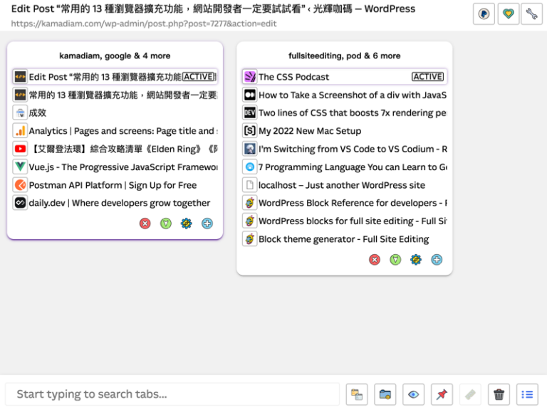 這個擴充功能提供了分頁搜尋、分組、暫存等功能,讓你可以更有效率地管理大量開啟的分頁,避免瀏覽器因為分頁過多而變慢。