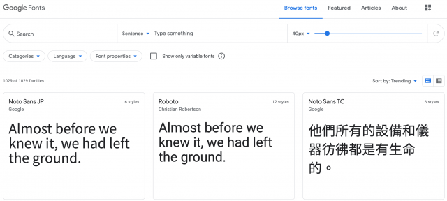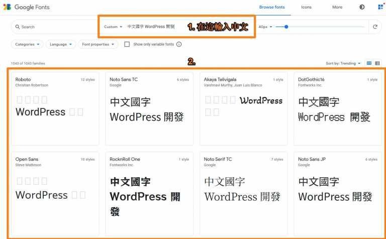 在 Google Fonts 中,您可以在 Custom 欄位中輸入中文,就可以看到各個字型的範例。沒有支援中文的字型會顯示亂碼,這樣就可以方便地搜尋和篩選支援中文的字型了。