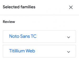 選擇後,Selected Families 區塊就會加上 Titillium Web 字型。這樣您就可以同時使用中英文字型了。