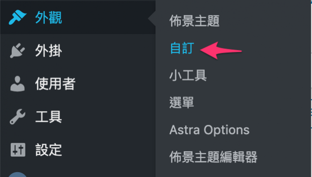 進入 WordPress 管理後台,點擊左側選單的【外觀】>>【自訂】,進入網站自訂介面。