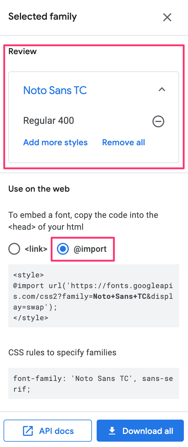 請勾選 @import 選項,下方會顯示待會要用到的 CSS 語法。這個 @import 語法會從 Google Fonts 載入您選擇的字型。
