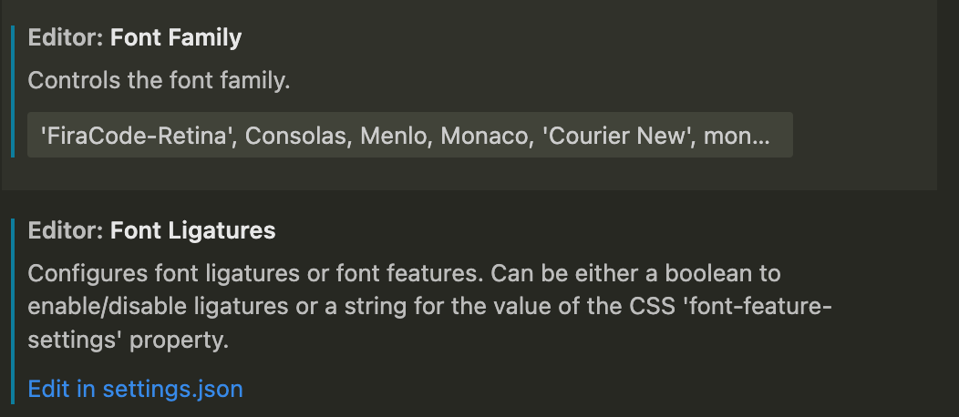 "editor.fontFamily": "Fira Code",