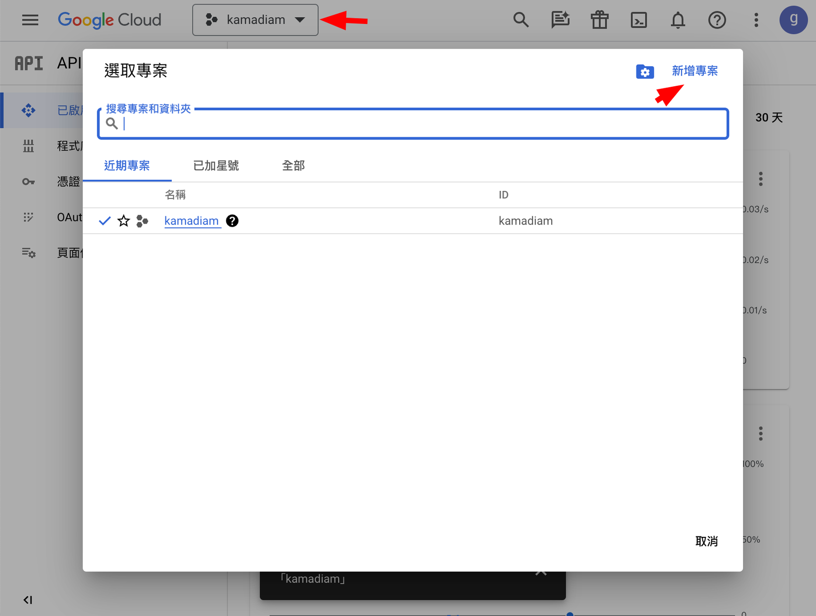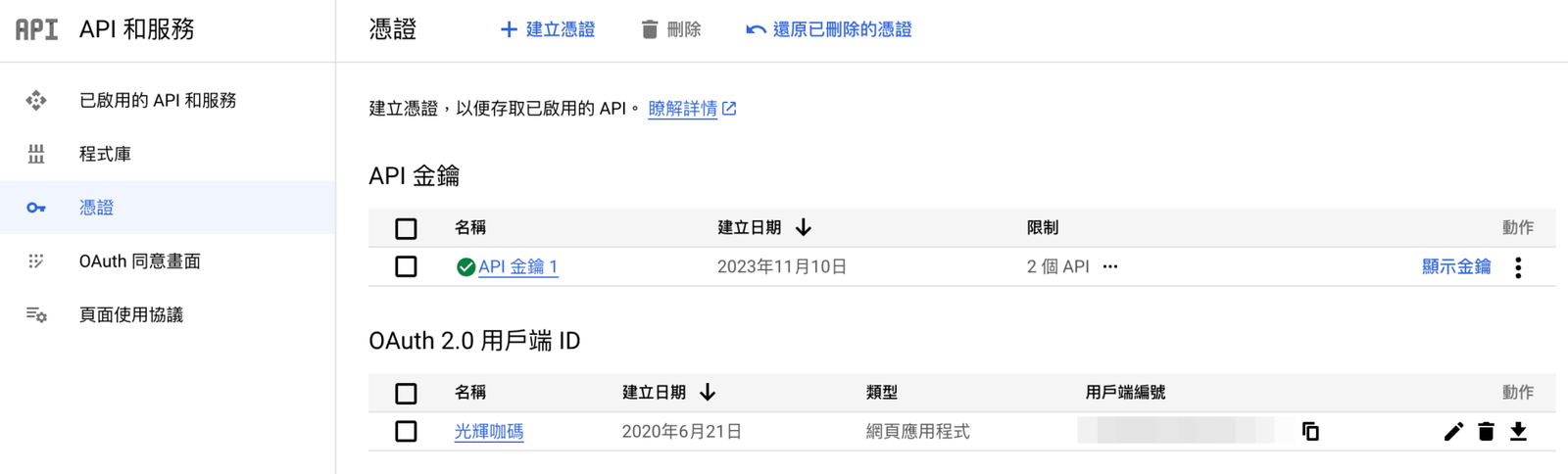 在相同的專案中,建立憑證,以便存取已啟用的 API。