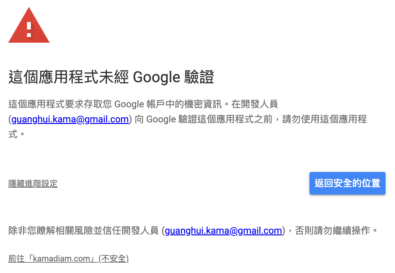 尚未經過 Google 驗證,所以會出現警告訊息,保護使用者資料。