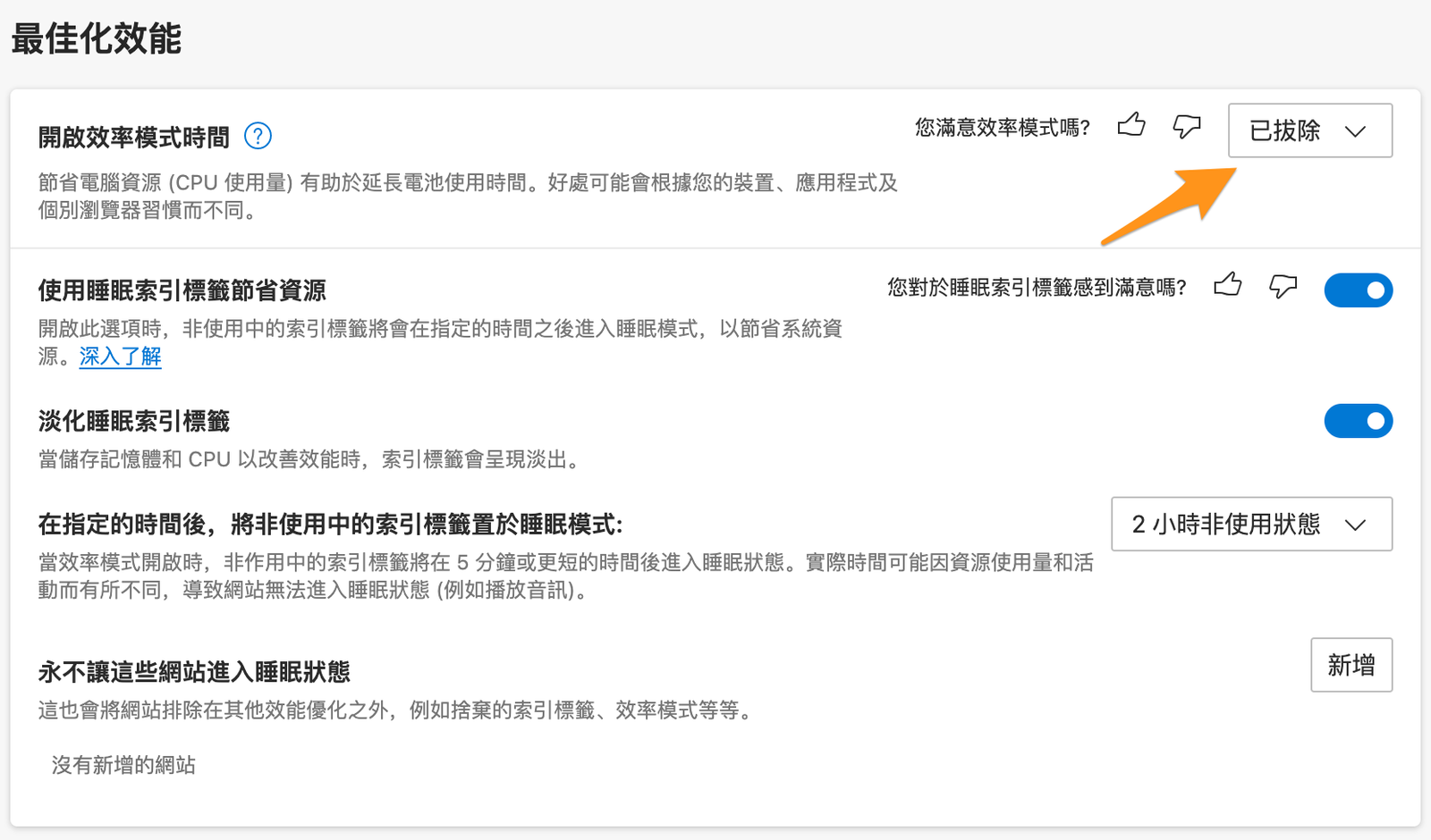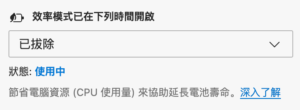 最佳化效能選擇 【已拔除】時,會自動偵測在使用電池時開啟效率模式,節省電源。
