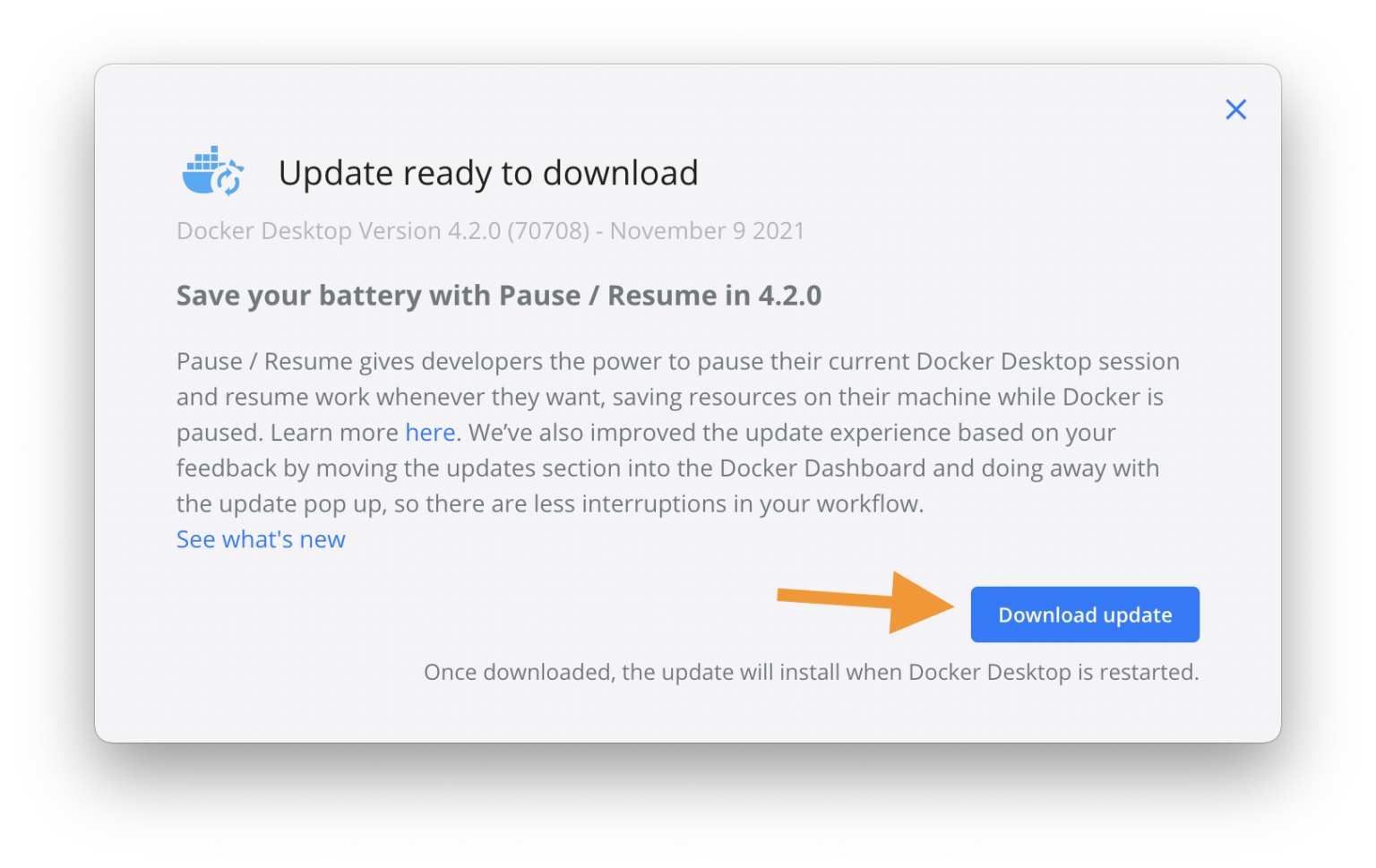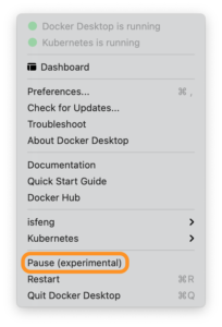 Docker 有個大缺點就是耗電,Docker 開著什麼都不做也會一直吃電,好在 4.2.0 版本之後,可以暫停 Docker,不用一直開開關關,而且暫停後真的不耗電。