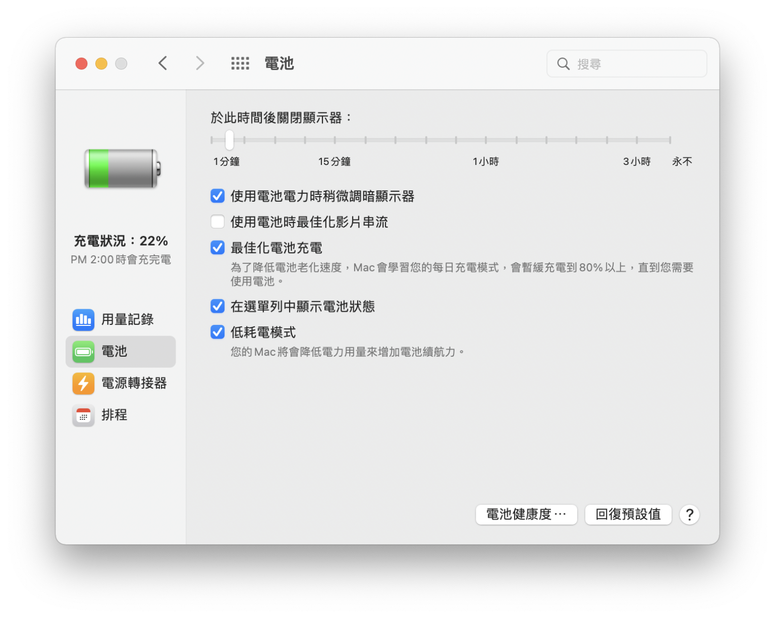 M1 本身已經非常的省電了,如果想要再更省電一點,可以打開系統偏好設定,進入電池設定畫面,勾選【低耗電模式】,這樣可以更進一步的減省電池用量。