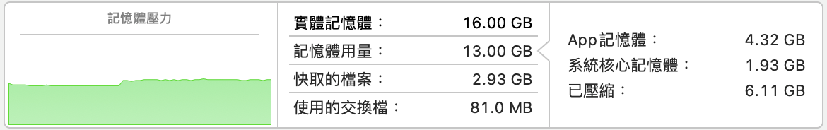 感覺不管開了很多程式或只是剛開機,Mac 好像會盡量優先使用記憶體,就是不管有沒有用到,先丟到記憶體就對了。