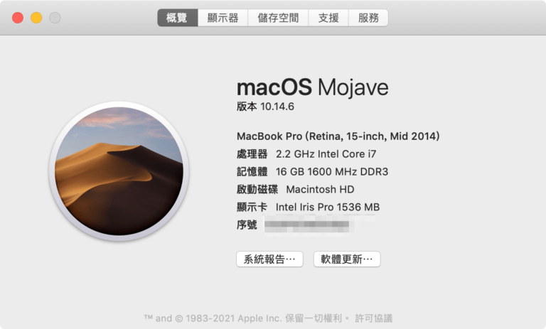 覺得新版的 Big Sur 和幾年前的 MacBook Pro 不太適合了,決定降版本到 Mojave,過度到 64 位元前的版本。
