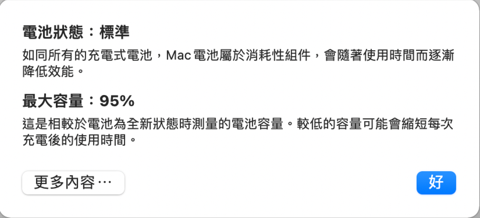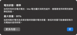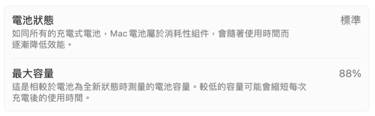單純記錄 MacBook Air M1 的電池使用狀況,MacBook 的電池有一定的年限,使用到一定程度就得更換,平常都開著一整天,電池不便宜,希望能撐久一點啊。