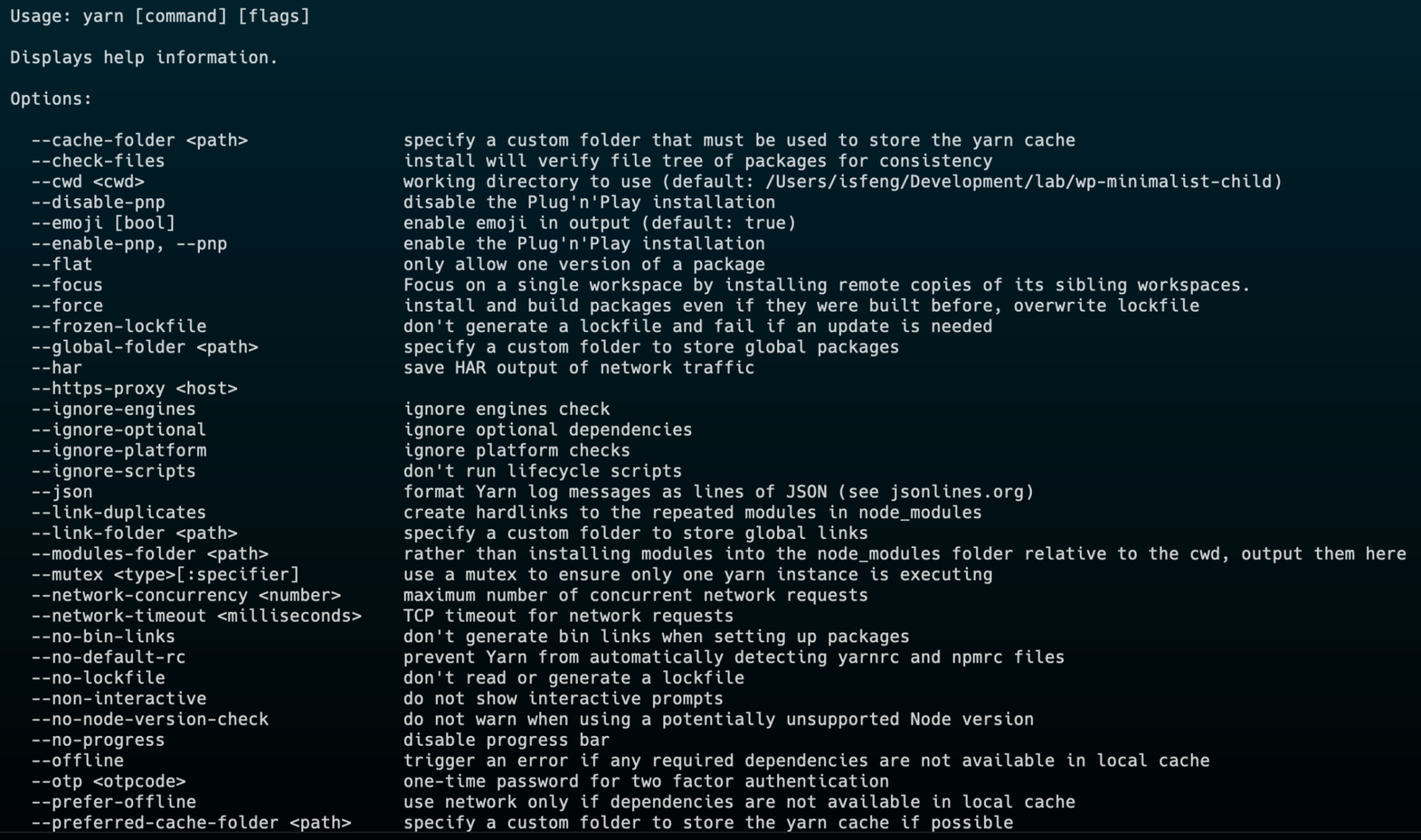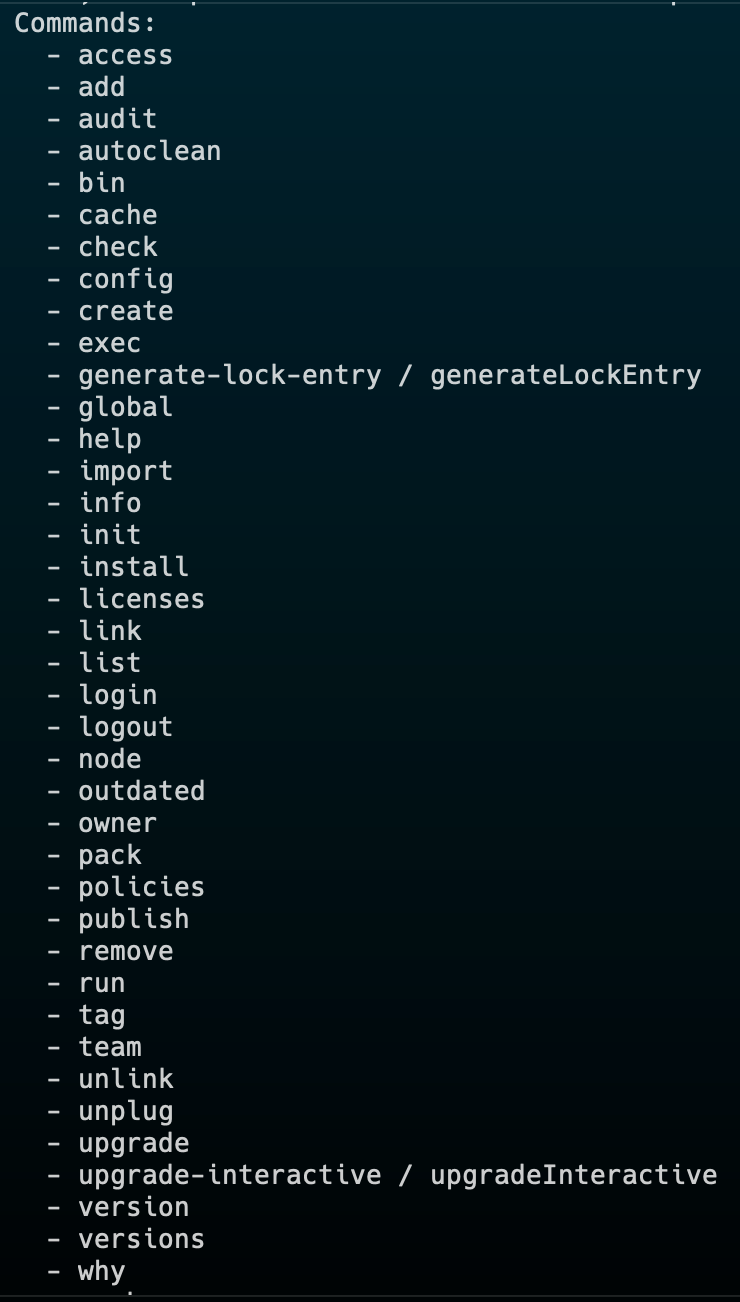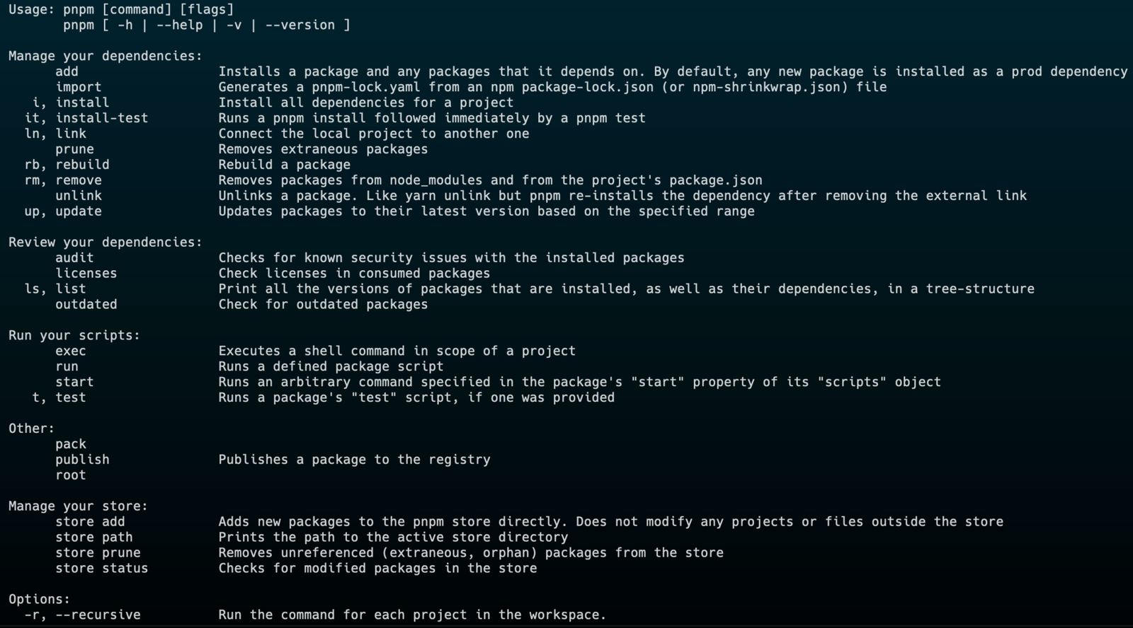 可以發現各自有不同的 command 用法,npm 比較簡潔,yarn 的參數超級多,pnpm 有分類說明,但實際上的用途,只有基本的幾個指令。