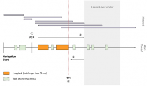 TTI 的計算稍微複雜一點,從 FCP 開始,在一個時間內(至少 5 秒),沒有長時間的程式任務 (大於 50ms 的程式任務) 在執行。