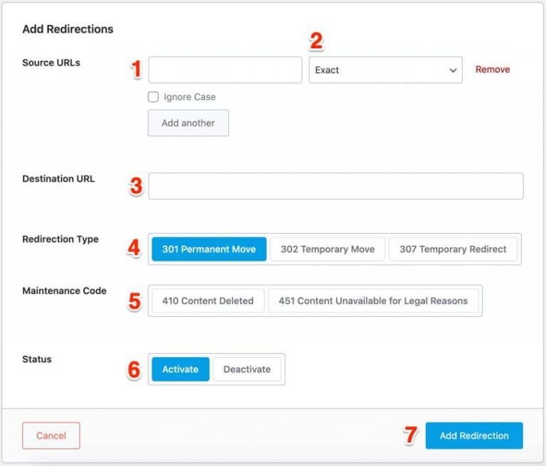 開啓 Rank Math Redirections 設定畫面: Rank Math -> Redirections -> Add New