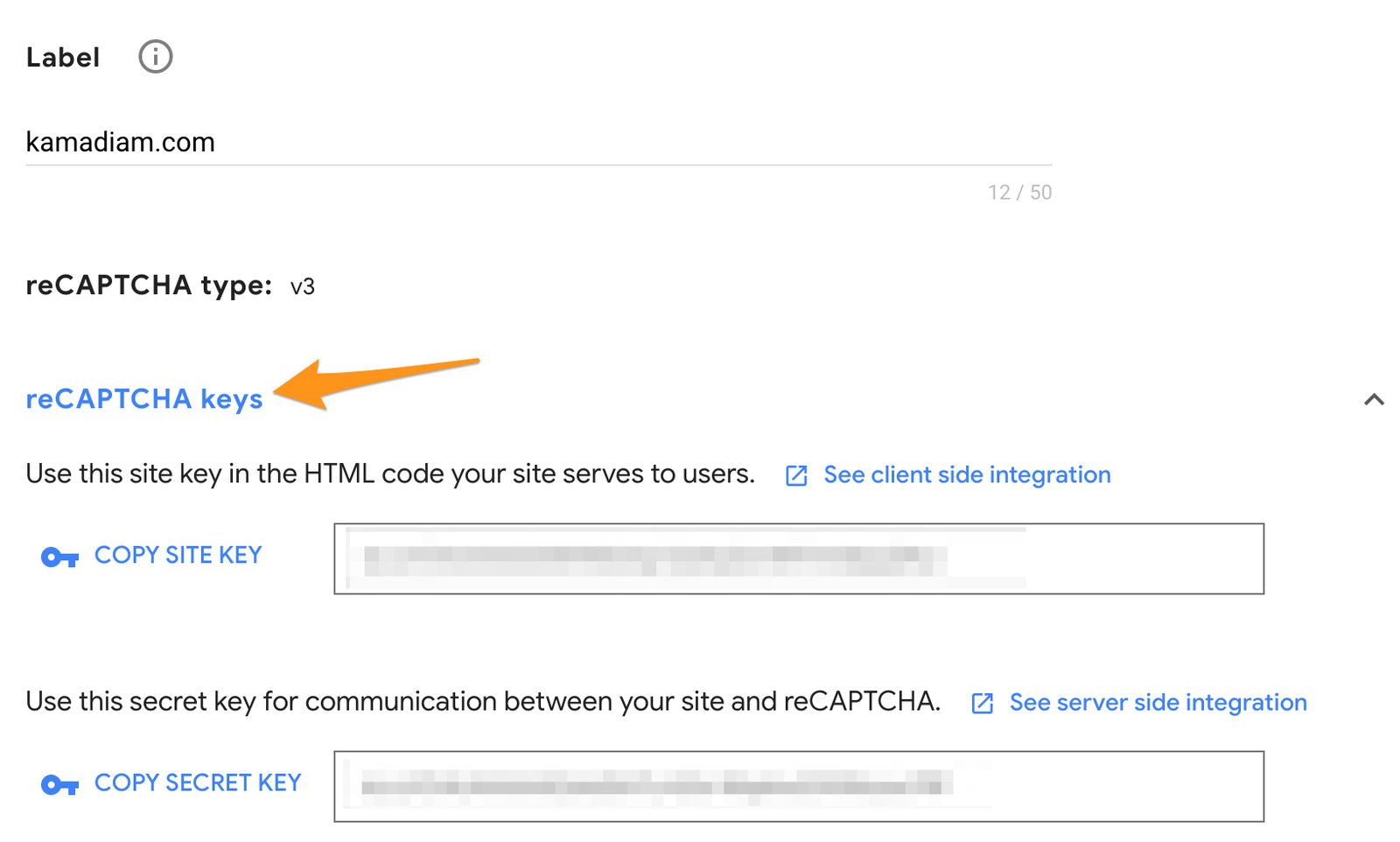 下方就會出現 SITE KEY 和 SECRET KEY。