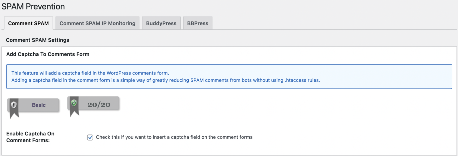 進入後台,點擊選單 WP Security -> SPAM Prevention,如下圖勾選 Enable Captcha On Comment Forms。