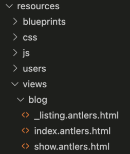partial 是可重複使用的模板區塊。在 resources/views/blog/ 目錄中建立一個名為 _listing.antlers.html 的新檔案。