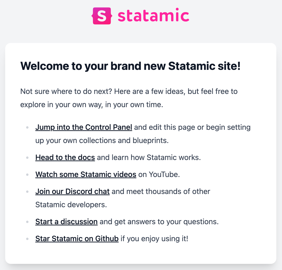 安裝後,您現在可以使用 statamic new 命令來啟動新的 Statamic 站點,並透過 CLI 設定精靈🧙♂️ 來引導您完成各種設定和選項。