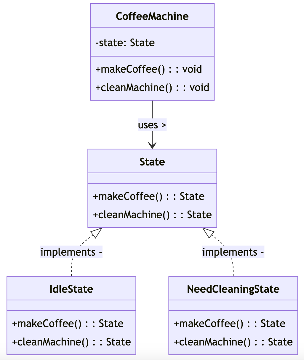 想像一個咖啡機,它有多種狀態,如「待機」、「煮咖啡」和「需要清潔」。使用 State Pattern,我們可以為每個狀態建立一個獨立的類別,並在這些類別中定義相應的行為。