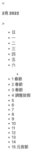 這個行事曆應該要能顯示 2022 一整年的日期,並能簡單標註週休二日和假日,最好還能標註一些特別日子。