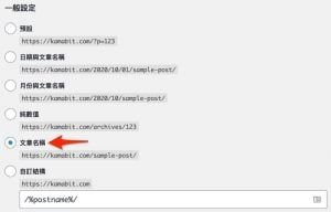 這樣的設定表示,在建立文章後,WordPress 會自動將文章名稱接在網址後面。