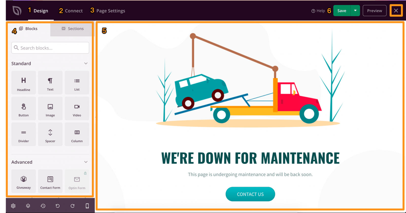 免費版本即可以設定【即將上線模式】,和【維護中模式】,也可以使用拖拉式視覺編輯器,無限制設計 Landing Pages。